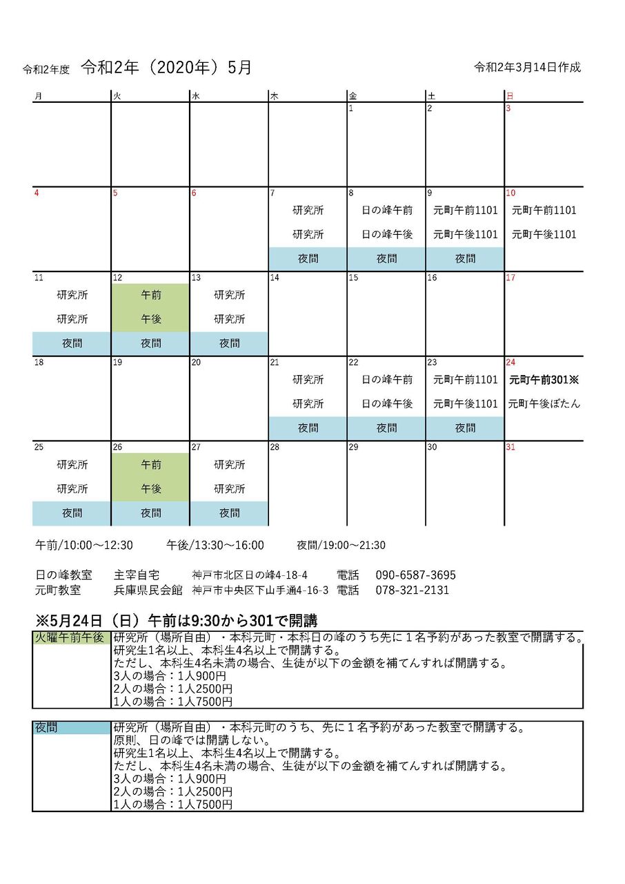 令和2年5月のカレンダー
